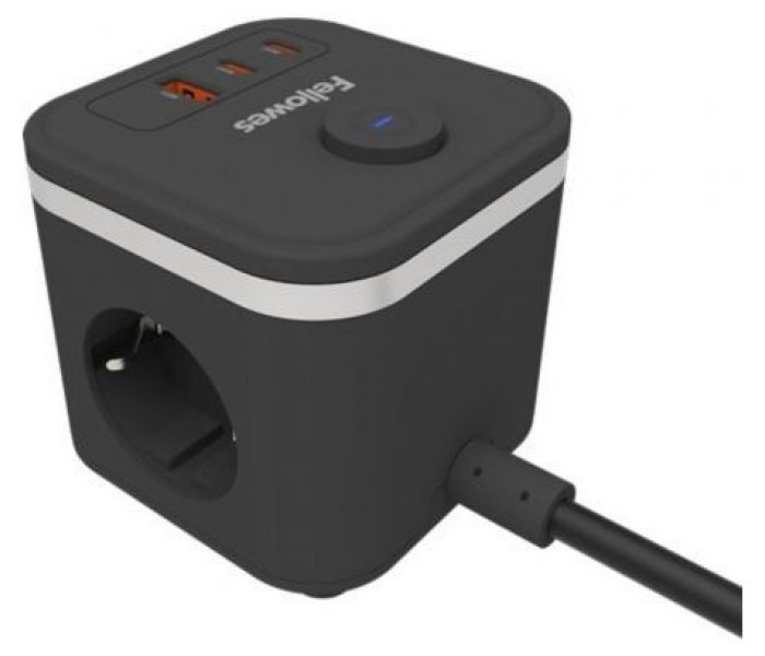 - Su forma cúbica reduce la acumulación de enchufes y deja más espacio para los dispositivos.