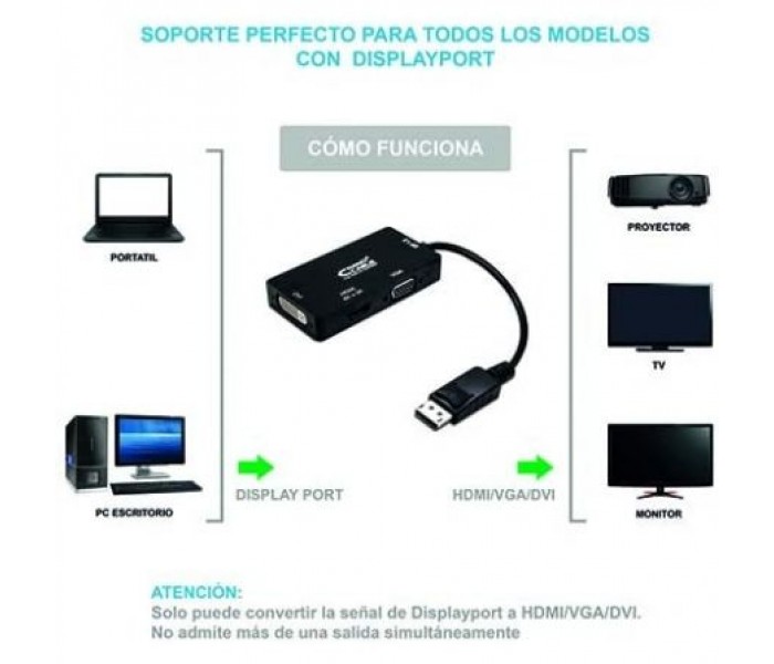 - Permite al usuario conectar un ordenador equipado con Displayport a una pantalla VGA, DVI o HDMI.