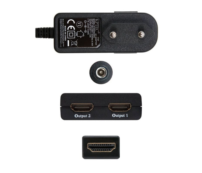 HDMI duplicador(splitter) 1X2 (una entrada, dos salidas) con pigtail (cable hdmi) 50 cm y fuente de alimentación.