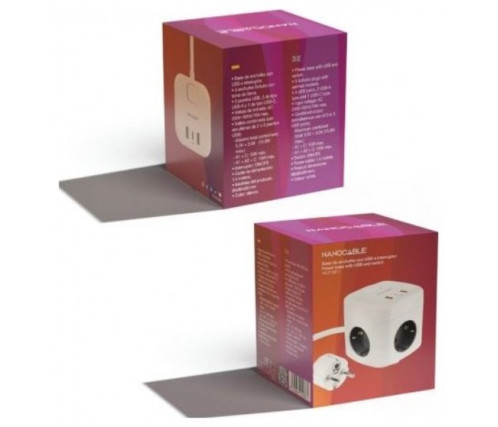 Regleta compacta en formato cubo con 3 enchufes de 16A y 3 puertos USB (2x USB-A + 1x USB-C).