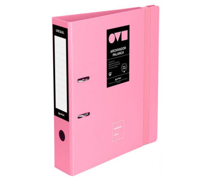 Archivador A4 65 mm Unequal Minimal Color rosa. Este archivador tiene sus cubiertas realizadas en polyfoam, un material resistente y ultraligero. Permite una apertura 360º y cuenta con un tarjetero en lomo con cartulina impresa pegada, mecanismo de palanca niquelado, ollao y rados. Tiene también un práctico cierre con goma plana, que impedirá que se pierdan todos sus documentos.