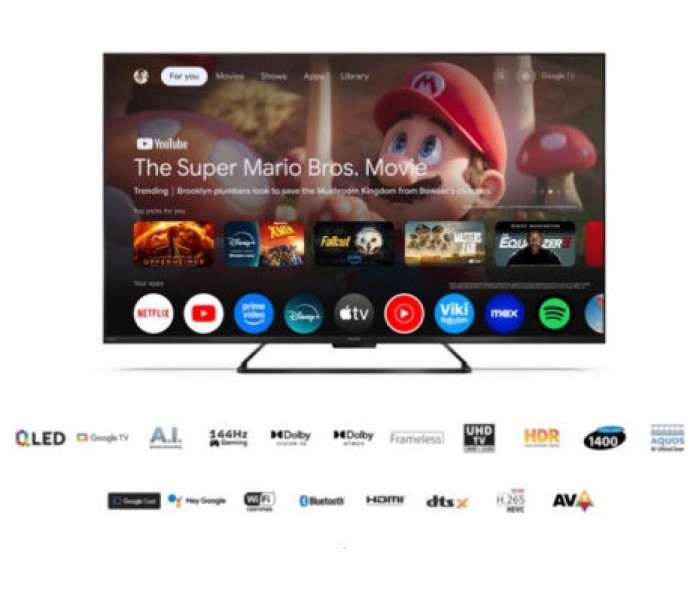 Televisor 4K Ultra HD Google TV™ QLED - rica gama cromática HDMI con eARC, VRR y ALLM Dolby Vision IQ™ - HDR inspirado en el cine con ajuste del brillo de la habitación Dolby Atmos® - Experiencia de sonido completamente envolvente Códec de audio envolvente DTS:X Posprocesamiento de audio 3D DTS Virtual:X Procesador de vídeo UltraClear con Inteligencia Artificial AQUOS Smooth Motion 144 Hz - Tecnología de interpolación de fotogramas Sensor de luz con OPC (Control óptico de imágenes) Mejore la experiencia de juego con la nueva capacidad de frecuencia de refresco de 120/144 Hz y la función VRR de HDMI . Libera todo el potencial de tu televisor con aventuras de juego. Prepárate para conquistar nuevas cotas de juego con Dolby Vision y Dolby Atmos para disfrutar de un compromiso visual y sonoro con el juego. El entretenimiento que te gusta. Con un poco de ayuda de Google. Google TV reúne películas, programas y mucho más de todas tus aplicaciones y suscripciones y los organiza solo para ti.