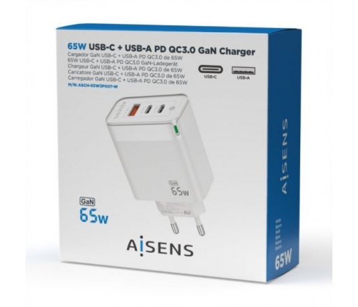 Cargador Gan de Pared Aisens ASCH-65W3P007-W/ 2xUSB Tipo-C/ 1x USB/ 65W