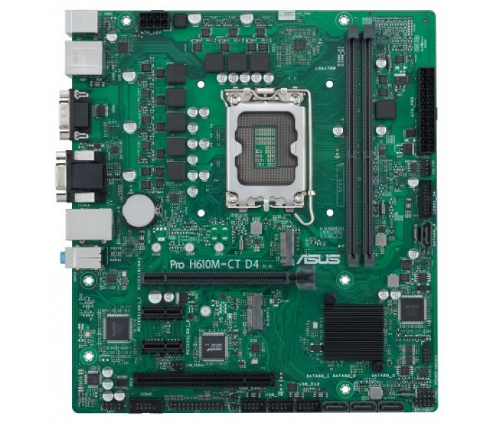 ASUS PRO H610M-CT D4-CSM. Fabricante de procesador: Intel, Socket de procesador: LGA 1700, Procesador compatible: Intel® Celeron®, Intel® Core™ i3, Intel® Core™ i5, Intel® Core™ i7, Intel® Core™ i9,.... tipos de memoria compatibles: DDR4-SDRAM, Memoria interna máxima: 64 GB, Tipo de ranuras de memoria: DIMM. Interfaces de disco de almacenamiento soportados: M.2, SATA III, Tipos de unidades de almacenamiento admitidas: HDD & SSD. Tipo de interfaz ethernet: Gigabit Ethernet. Componente para: PC, Factor de forma: micro ATX, Familia del chipset: Intel