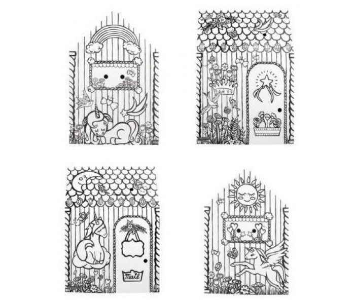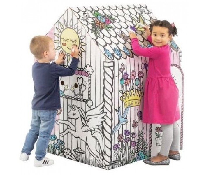 Casita de juegos realizada en resistente cartón ondulado con motivo de unicornio, lista para colorear, fácil montaje en dos piezas, puertas y ventanas que se abren e impresa con tintas al agua sobre cartón certificado FSC.