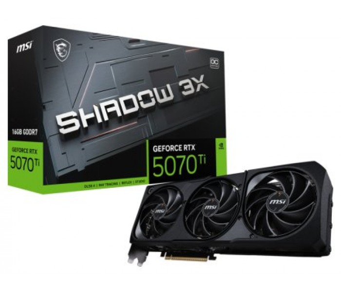 MSI GeForce RTX 5070 Ti 16G SHADOW 3X OC. Familia de procesadores de gráficos: NVIDIA, Procesador gráfico: GeForce RTX 5070 Ti. Capacidad memoria de adaptador gráfico: 16 GB, Tipo de memoria de adaptador gráfico: GDDR7, Ancho de datos: 256 bit. Máxima resolución: 7680 x 4320 Pixeles. Versión DirectX: 12 Ultimate, Versión OpenGL: 4.6. Tipo de interfaz: PCI Express x16 5.0. Tipo de enfriamiento: Activo, Número de ventiladores: 3 Ventilador(es)