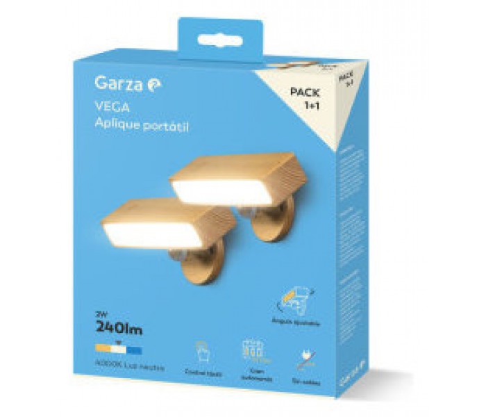 1404154;Garza;675;Iluminacion;608;Seguridad y protección;590;Servicios Generales;;;;;Color del producto;Marrón, Madera;0;;;;;;;;;;;;401558C;8430624015586;PACK 2 APLIQUES LED PORTÁTIL VEGA MADERA 1+1 GARZA 401558C;El aplique portátil VEGA con batería recargable se caracteriza por su diseño moderno y minimalista y por su fácil instalación, ya que no necesita cableado, es tan fácil como colocarlo y disfrutar de una luz LED de hasta 120lm regulables. Con su luz neutra y alta fidelidad de reproducción de colores CRI>90 es ideal para usar como luz de lectura, para caravanas, cocinas, armarios, etc. Este aplique pesa solo 580g y cuenta con hasta 30 días de autonomía en el modo suave.