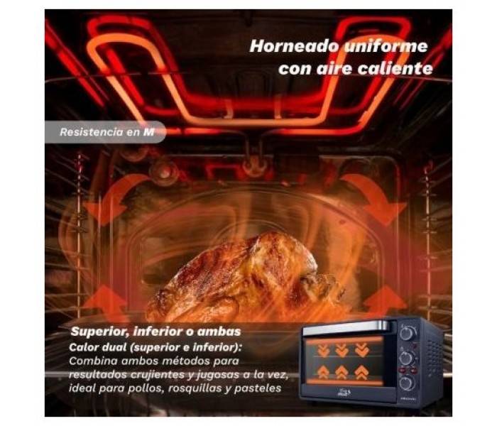 El horno eléctrico de GRUNKEL HR-28COOK es perfecto para quienes buscan rendimiento, versatilidad y eficiencia en su cocina. Con 1600W de potencia y capacidad de 28 litros, permite preparar desde carnes y pescados hasta pasteles. Su resistencia superior en M y el sistema de convección con botón independiente garantizan una cocción más rápida, uniforme y eficiente. Dispone de 3 modos de calor (superior, inferior y combinado), temperatura regulable hasta 230°C y temporizador mecánico de hasta 60 minutos con aviso acústico. Incluye una luz interior activable para vigilar el proceso sin abrir la puerta. El diseño robusto cuenta con tirador de seguridad de tacto frío y acabados en acero inoxidable que aportan durabilidad y estilo. Se entrega con bandeja, parrilla y asa extractora. El horno GRUNKEL HR-28COOK es una solución completa para cocinar como un chef, incluso en espacios compactos.Especificaciones