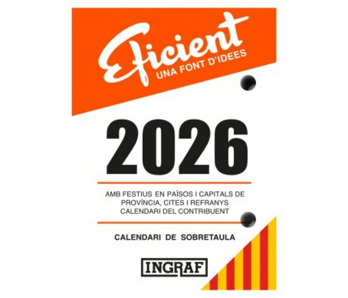 Bloque calendario de sobremesa. Anualidad día página. Impreso a 2 colores. Papel de 70 gr/m²..Medidas 8,2 x 11,6 cm. 7 páginas por semana. Contiene calendario del contribuyente, festivos en países y capitales de provincia, máximas y proverbios 70 GRMS CATALAN.