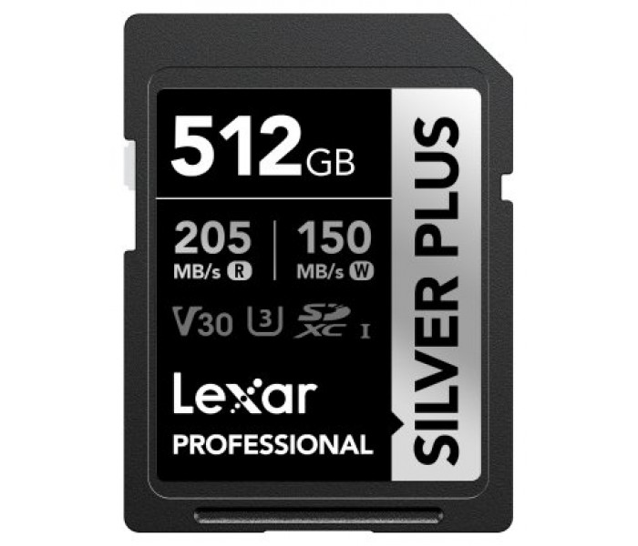 Lexar Professional SILVER PLUS. Capacidad: 512 GB, Tipo de tarjeta flash: SDXC, Tipo de memoria interna: UHS-I, Velocidad de lectura: 205 MB/s, Velocidad de escritura: 150 MB/s, Clase de velocidad UHS: Class 3 (U3), Clase de velocidad de vídeo: V30. Funciones de protección: Protección contra caídas, Protección contra campos magnéticos, Resistente a golpes, Resistente..., Color del producto: Negro