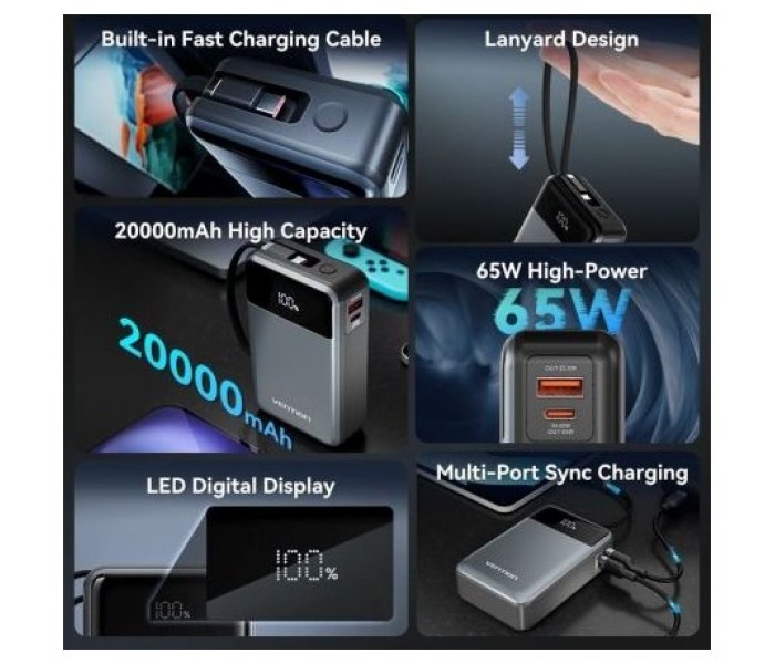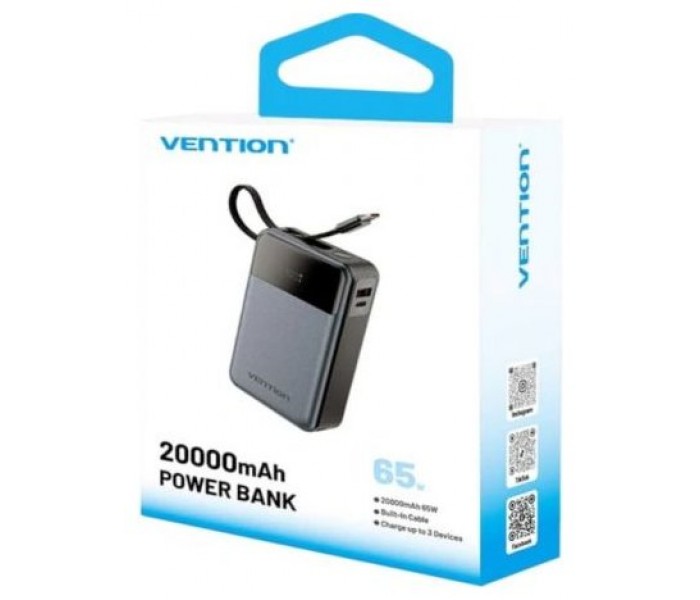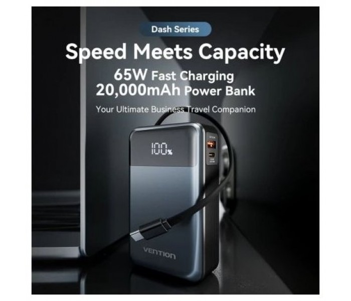 20000mAh Power Bank (USB-C + USB-C/USB-A) with Built-in USB-C Cable 65W Black LED Display Type