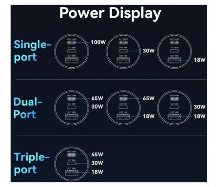 - Salida USB-C1 + USB-C2 + USB-A1: 45W + 30W + 18W