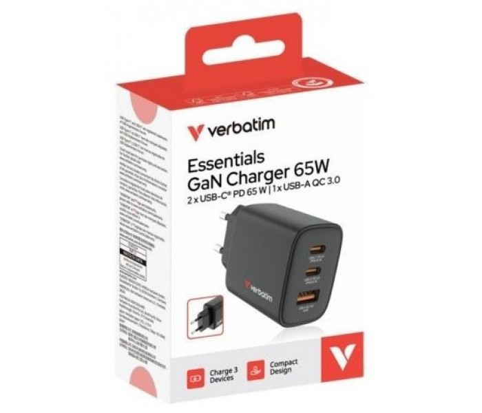 Carga de forma más inteligente y rápida con el cargador GaN Verbatim Essentials de 65 W: la solución de carga elegante y de alto rendimiento con tecnología GaN y compatibilidad con la carga simultánea de varios dispositivos.