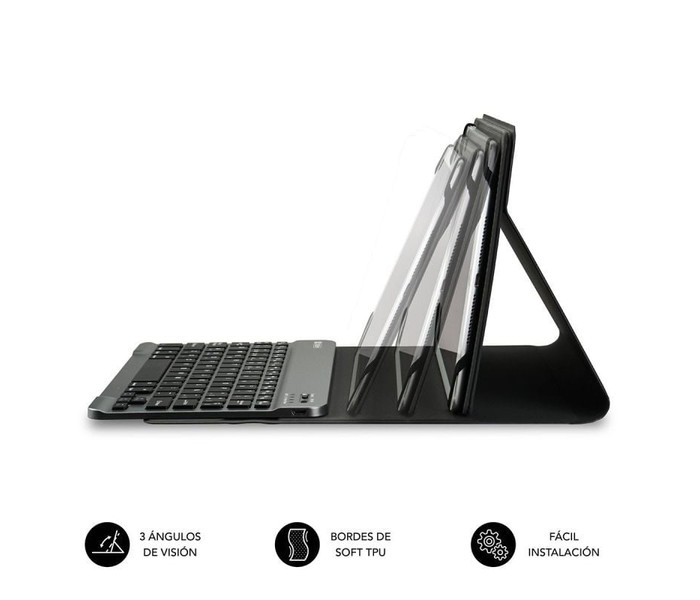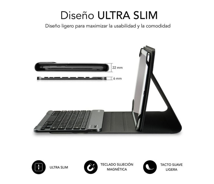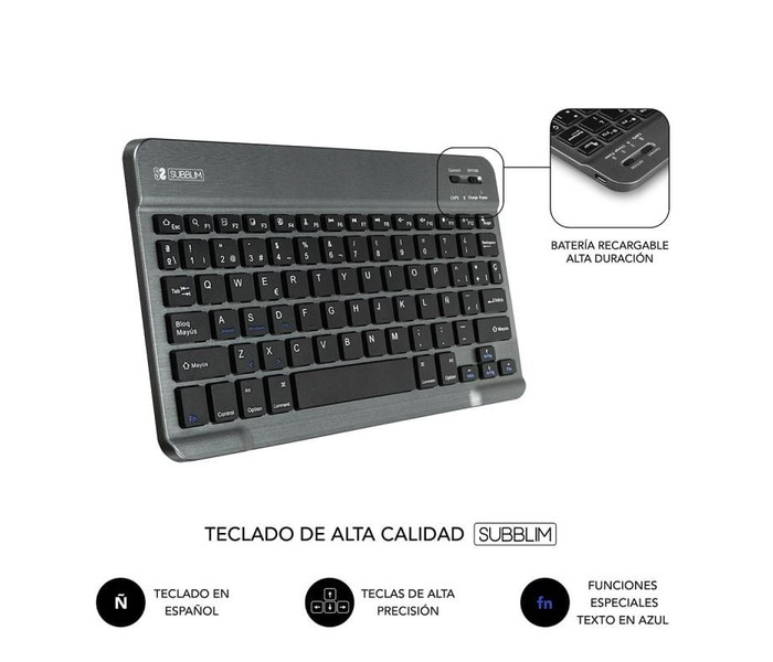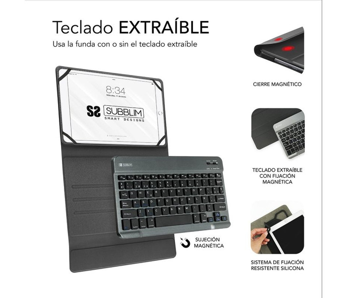 Este Teclado Bluetooth extraíble viene con una funda de alta calidad compatible con todas las Tablet del mercado de 10.1" a 10,8”. Se conecta a la perfección con cualquier dispositivo compatible con la tecnología Bluetooth para una escritura más rápida y cómoda. Un mecanismo de resorte debajo de cada tecla asegura una respuesta táctil con cada golpe, lo que le ayuda a escribir más rápido y con menos errores que en una pantalla táctil. El diseño de la funda Ultradelgada agrega la máxima protección con un volumen mínimo. Encuentra el ángulo adecuado en modo horizontal con el soporte ajustable que se personaliza según sus preferencias personales de visualización. Se puede acceder a todas las funciones de la Tablet incluso con la funda puesta. Esta funda versátil y protectora de Subblim presenta un teclado extraíble que le permite cambiar entre el trabajo y el juego con facilidad en cualquier lugar donde lo uses.